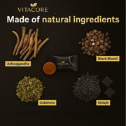 La falta de energía, la baja resistencia y el bajo rendimiento en la cama están relacionados con la disminución de testosterona. Shilajit y ashwagandha actúan en sinergia para elevar los niveles de testosterona de forma natural, estimular la circulación y mejorar los niveles de óxido nítrico , proporcionando una energía más fuerte y duradera donde más se necesita.
